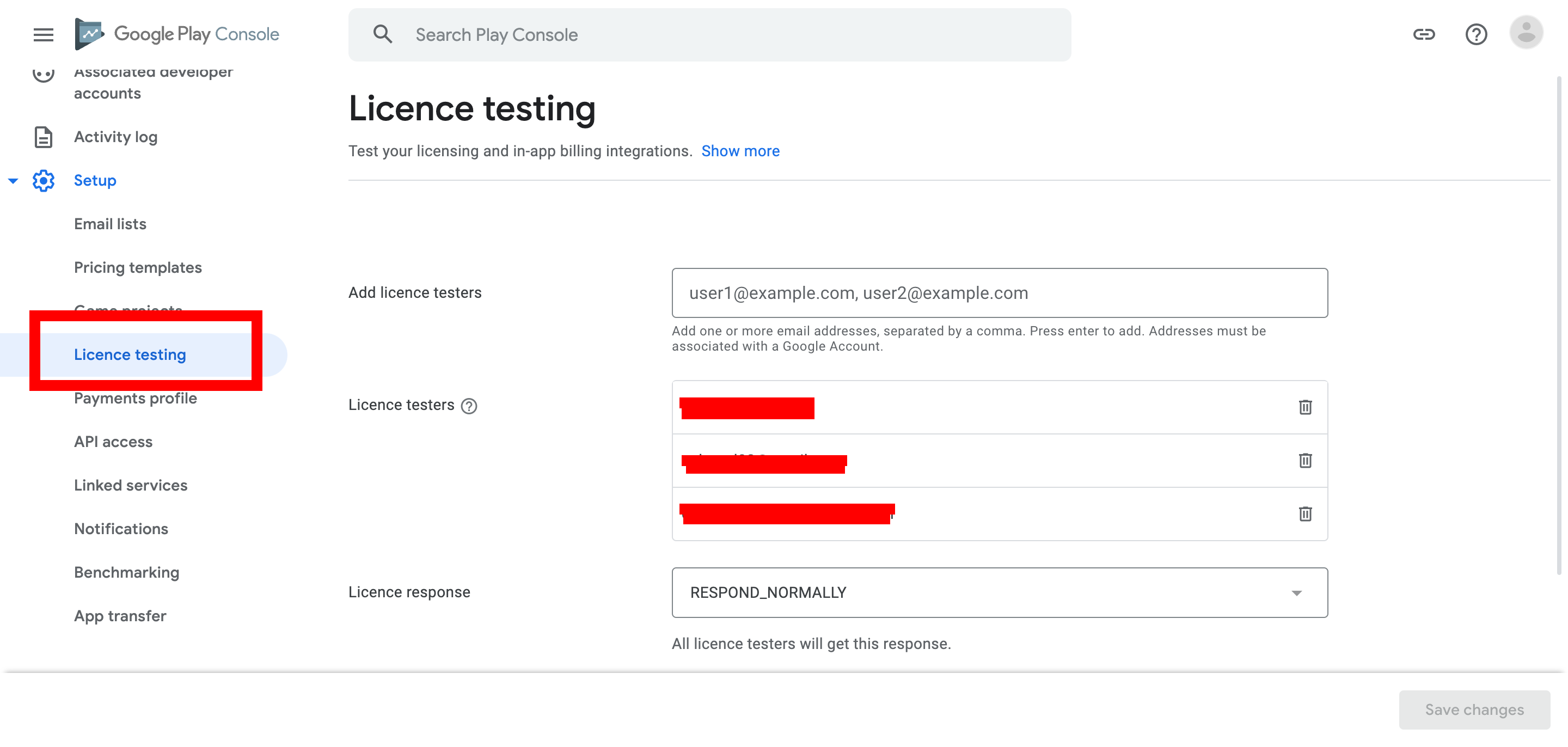**1.)** Go to PlayStore Console -> Setup -> Licence Testing
