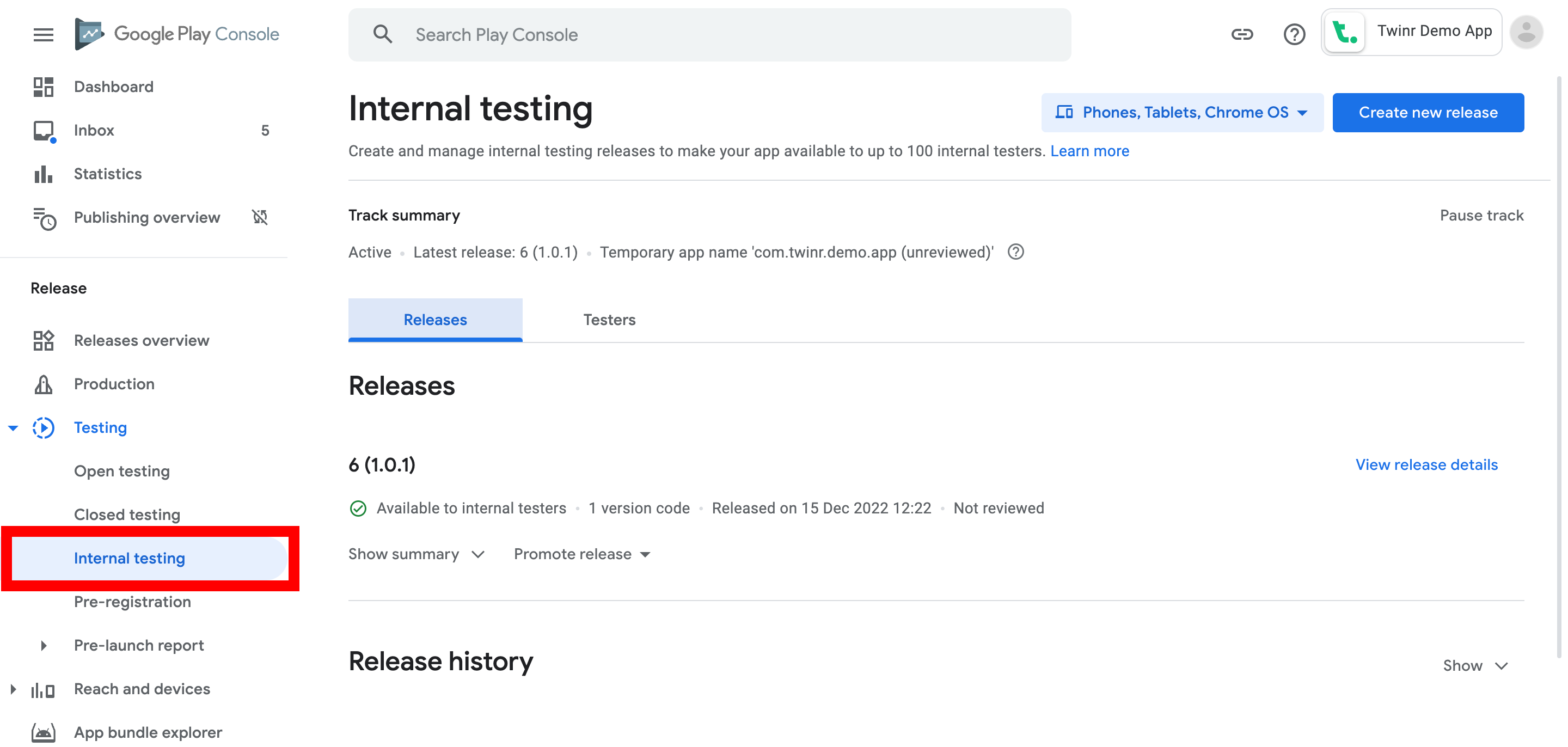 **4.)** Now, you need to prepare an APK and upload it under internal tester. To do that, go to PlayStore Console -> Select Your App -> Testing -> Internal testing.