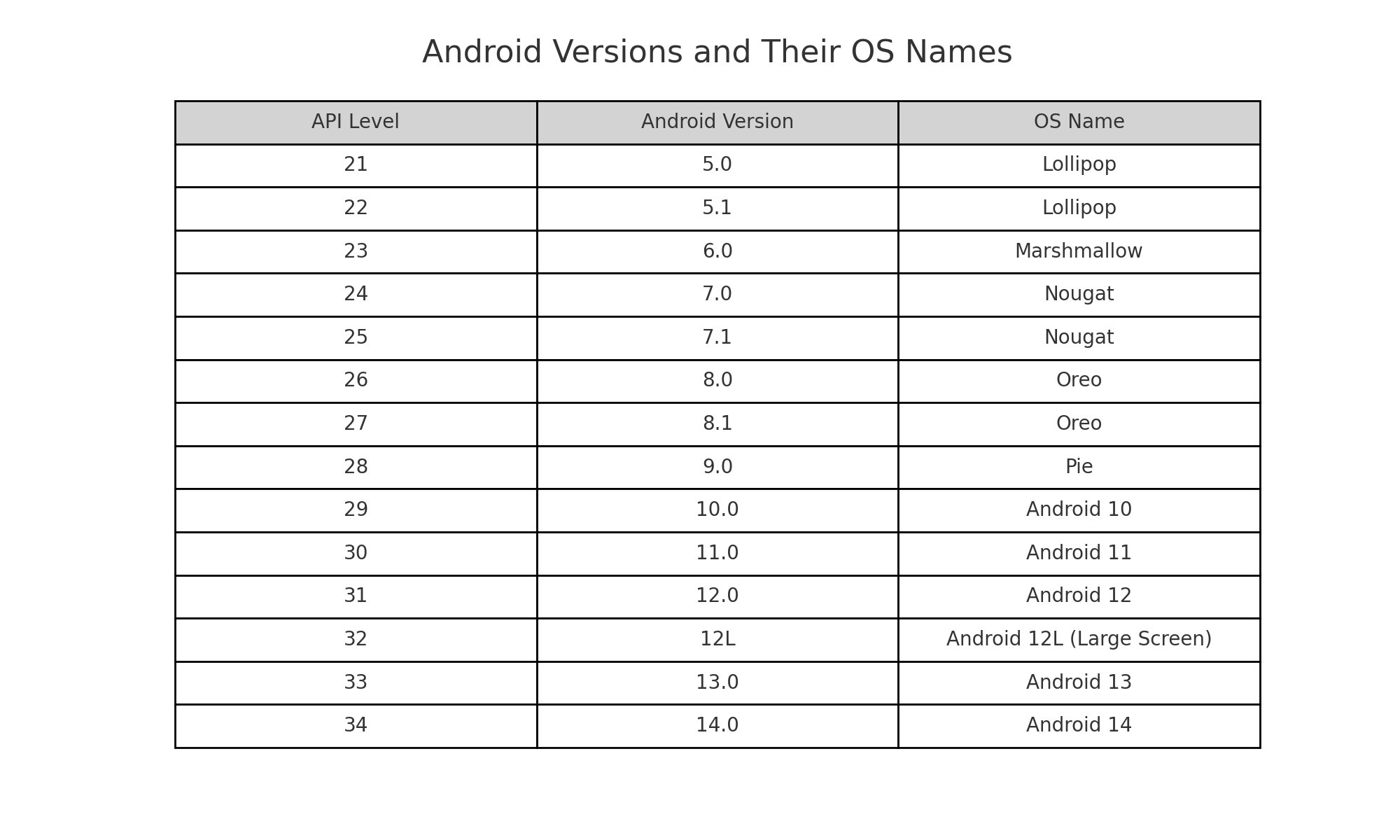 * Here's a table of Android versions from 21 to 34 with their corresponding OS names: